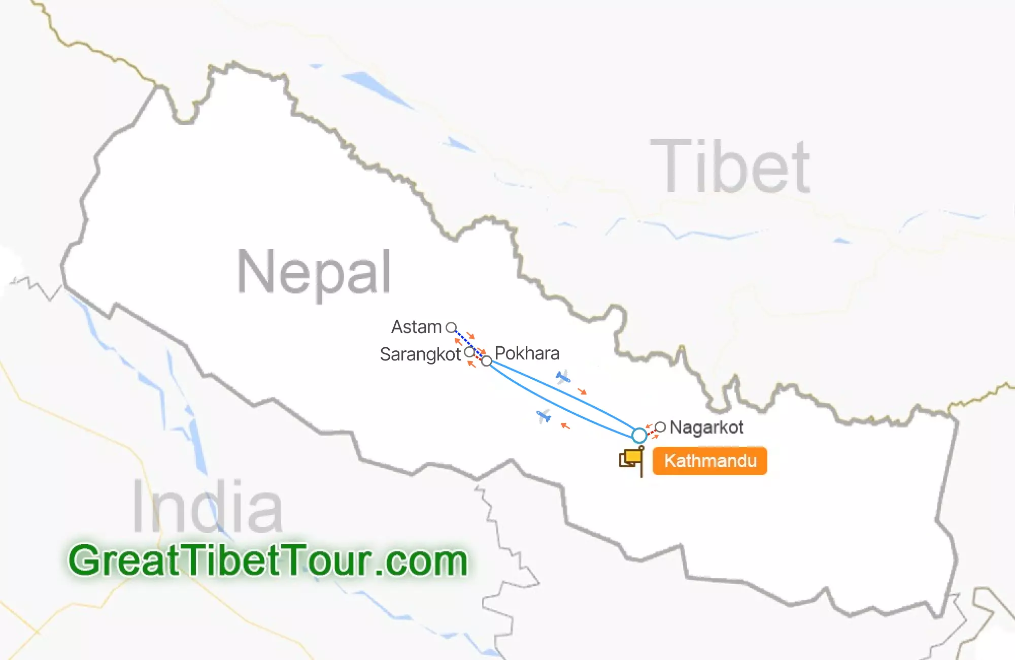 | Ruta: | Katmandú - Bhaktapur - Nagarkot - Sarangkot - Pokhara - Katmandú |