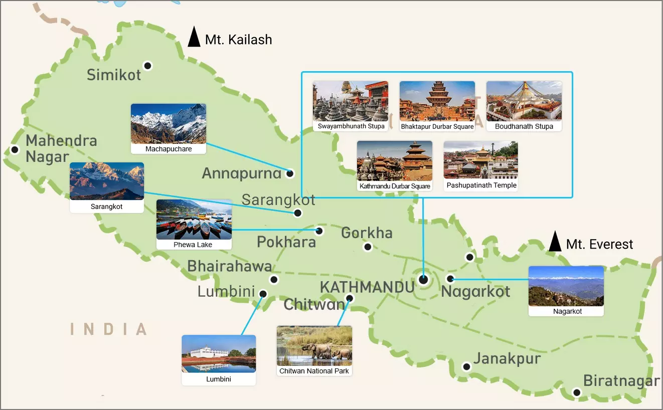 네팔은 남아시아에 위치해 있으며, 히말라야 중부의 남쪽 기슭에 자리잡고 있습니다. 북쪽으로는 중국의 티베트 자치구와 접경하고 있으며, 동쪽, 서쪽, 남쪽으로는 인도로 둘러싸여 있습니다. 세계에는 해발 8,000미터가 넘는 봉우리가 14개 있는데, 그 중 8개가 네팔에 위치해 있어 '설산의 왕국'으로 알려져 있습니다. 또한 아시아 문명이 만나는 곳이기도 합니다. 힌두교와 불교가 오랫동안 공존해 왔으며, 고대 궁전 건축물과 웅장한 자연 경관이 어우러져 네팔은 세계적으로 유명한 관광지 중 하나가 되었습니다. 여기 네팔에서 꼭 방문해야 할 최고의 관광지 목록을 소개합니다.