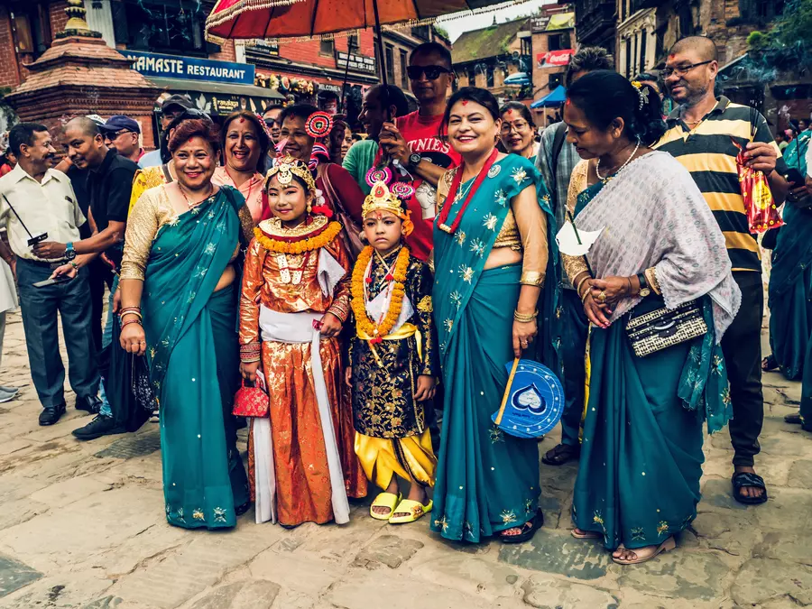 The festival begins as early as 5 or 6 a.m., with the bustling sounds of drums, horns, and students’ “stick dance” chants filling the Kathmandu Valley. Women wear bright red saris, while homes are decorated with flowers and large copper basins filled with water and floating fragrant petals, creating a festive and sacred atmosphere. Families who lost loved ones during the past year often prepare tall, straw-like effigies adorned with umbrellas, straw horns, floral garlands, and the portraits of the deceased. The height and decoration of these effigies vary depending on the age of the departed and each family’s means.