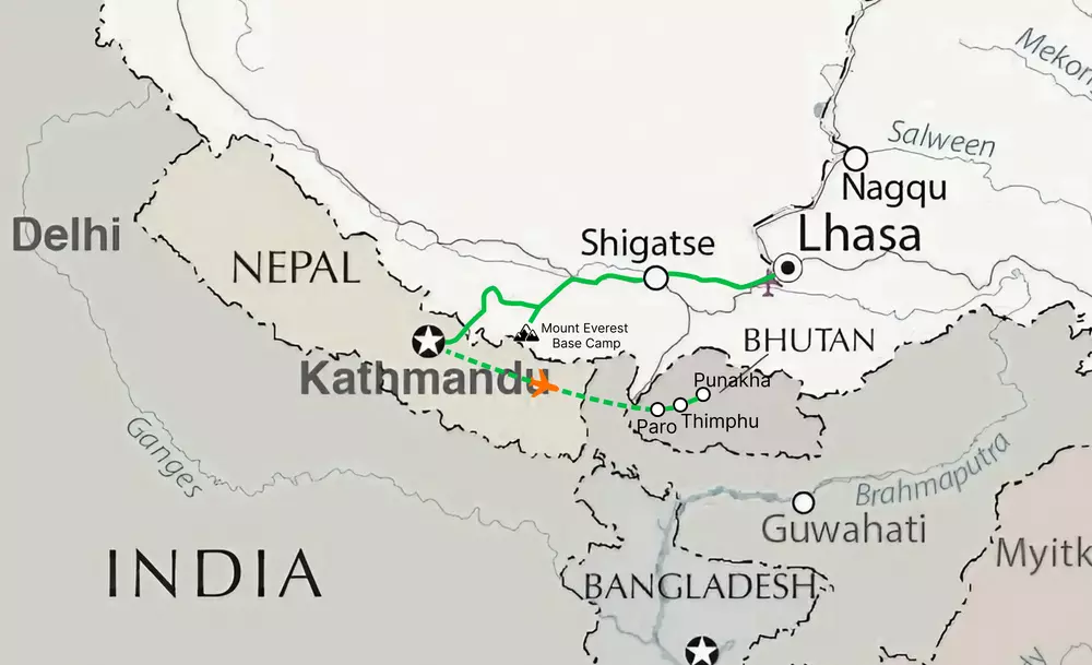 | 路線: | 拉薩 - 日喀則 - 珠峰大本營 - 吉隆 - 加德滿都 - 帕羅 - 普那卡 - 帕羅 |